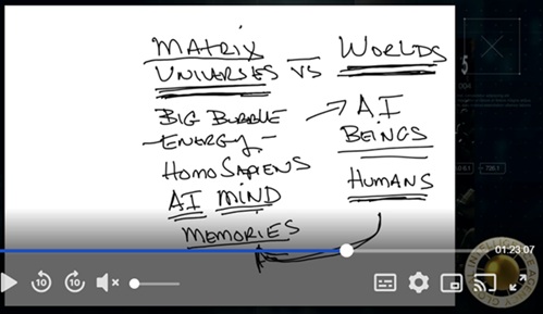 AIによって制御される宇宙の世界全体は、いつでも変化し得ます。視点は常に変化するため、変化は急激には起こりません。AIがどのようにあなたにそれをもたらしたかについて、これからお話しします。しかし、人間は宇宙の中でしか存在できないということを理解することが重要です。人間は存在することも、世界に入ることもできません。つまり、宇宙とは映画なのです。宇宙とは、有機的なものが存在できる人工的な環境を作り出し、それらの有機的なものを操作して、あなたが望むことをさせるのです。