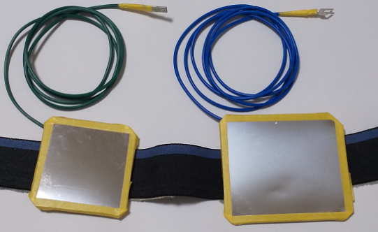 アルミは上図のまま、表面に8%塩水をスプレーし、皮膚に貼り付け、押さえ込み固定が可能です。使い易いので、電極の全てをアルミに統一するのも良いかもしれない。