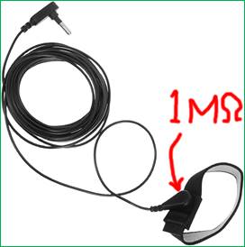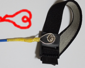 静電気防止リストバンドはどの製品でも「→」の部分に「1MΩ」の抵抗が入っています。この「1MΩ」は大きすぎます。