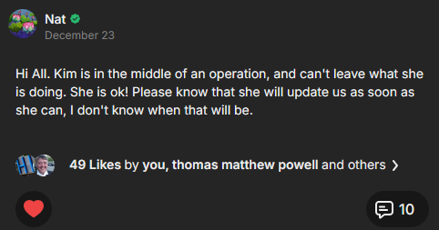 Hi All. Kim is in the middle of an operation, and can't leave what she is doing. She is ok! Please know that she will update us as soon as she can, I don't know when that will be.