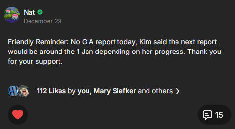 Friendly Reminder: No GIA report today, Kim said the next report would be around the 1 Jan depending on her progress. Thank you for your support.