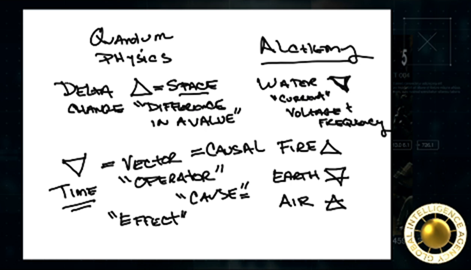 まず、ベクトルと反転について少しお話しましょう。比較して、ここで少しホワイトボードを使ってみましょう。量子物理学と錬金術を比較してみましょう。具体的には、自然やソースを不自然な方法で利用して物事を行うという点です。生命の本質や火花を実際に扱う時、そこには指示が伴います。本質に何をすべきかを指示する必要はありません。しかし、繰り返しますが、彼らは実際にはその生命の火花を持っていませんでした。ですから、彼らはそれを反転させる方法を見つけ出さなければなりませんでした。それは何百万年もの間、最善の努力であり続けてきました。これは、彼らが抱える難問を解決しようとしてきた、まさに長年にわたる努力です。さて、物理学ではこれをデルタと呼びます。方程式では、このように三角形のように見えますが、これは多くの場合、変化を意味します。状態の変化は、値の違いを示すこともあります。その値は、質量の違い、エネルギーの違い、あるいは電磁気の違いを意味する場合があります。多くの場合、何らかの違いを示します。