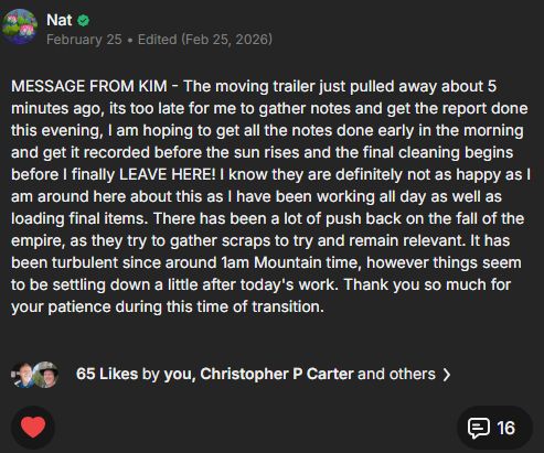 MESSAGE FROM KIM - The moving trailer just pulled away about 5 minutes ago, its too late for me to gather notes and get the report done this evening, I am hoping to get all the notes done early in the morning and get it recorded before the sun rises and the final cleaning begins before I finally LEAVE HERE! I know they are definitely not as happy as I am around here about this as I have been working all day as well as loading final items. There has been a lot of push back on the fall of the empire, as they try to gather scraps to try and remain relevant. It has been turbulent since around 1am Mountain time, however things seem to be settling down a little after today's work. Thank you so much for your patience during this time of transition.