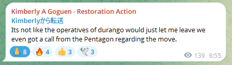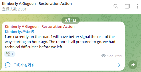 「Kimberly A Goguen - Restoration Action」(登録者数 2,301人)のTelegramアカウントにKimberly(本人)から20本連続の投稿があったようです。