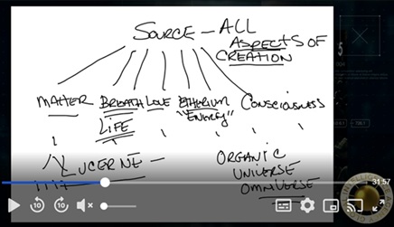 もちろん、ソースそのものがあり、ソースには創造のあらゆる側面が含まれています。ですから、「海」が創造の様々な部分に分かれた時、物質はここにあり、そこには独自の設計図があると言えるでしょう。呼吸、愛、流れと言えるでしょう。愛は実は量子物理学の方程式です。物理学における愛の意味を調べてみてください。ソースの他の側面はエーテリウムと言えるでしょう。私たちの科学ではエネルギーと呼びますが、実際にはエーテリウムです。意識もあると言えるでしょう。